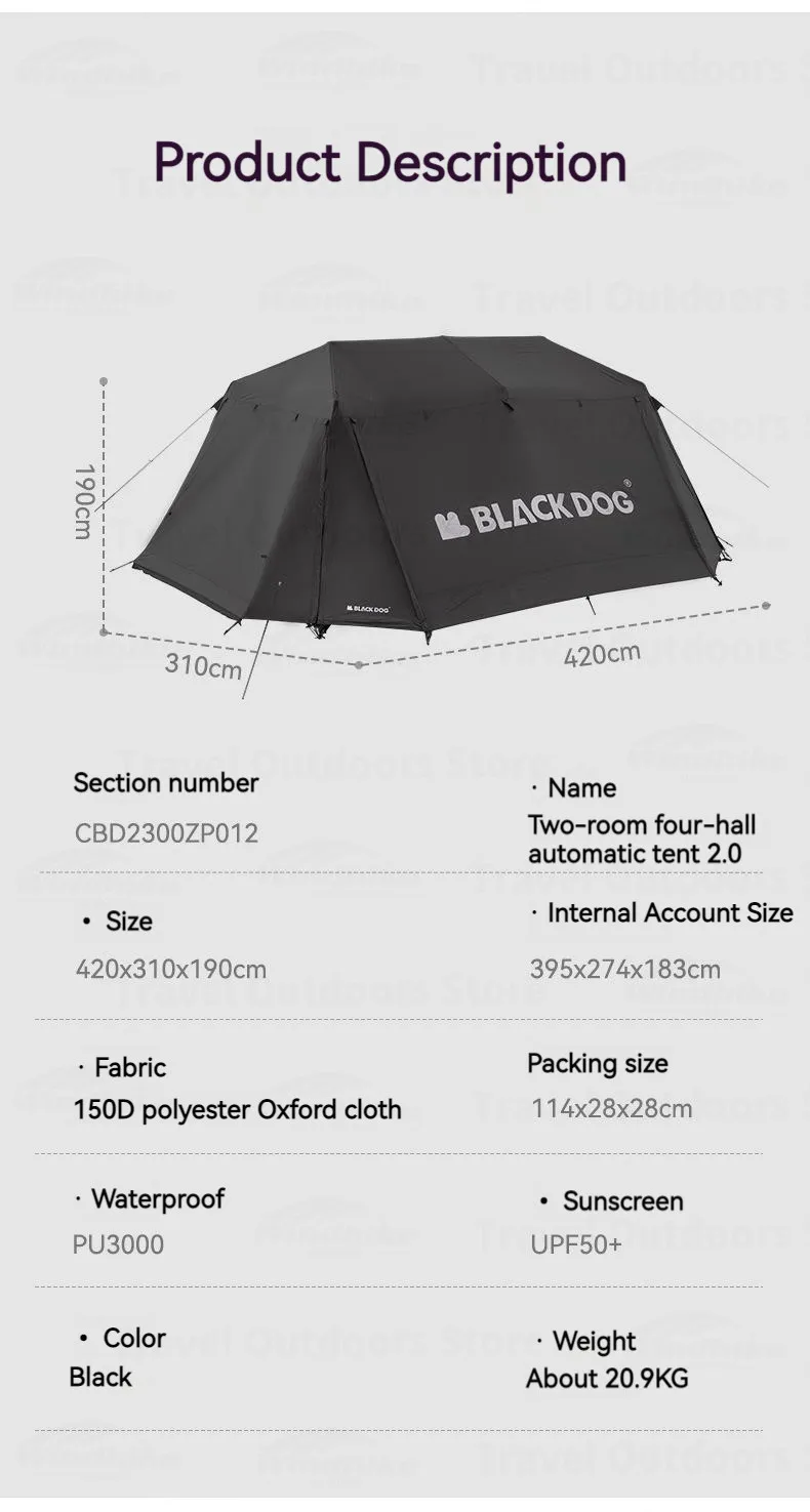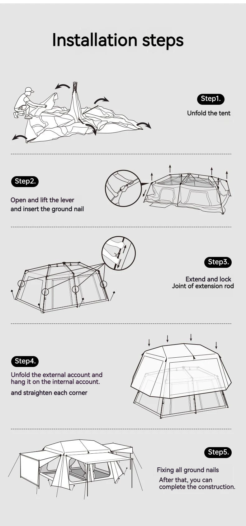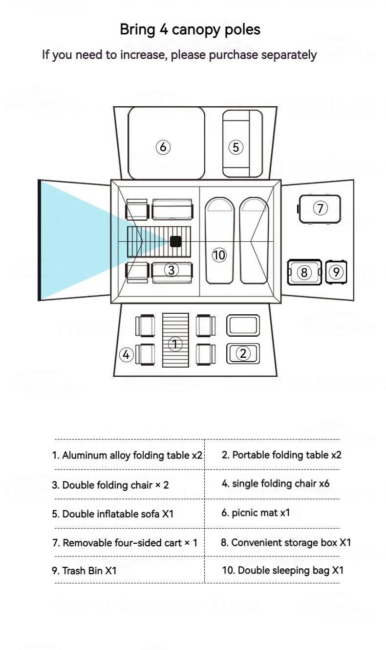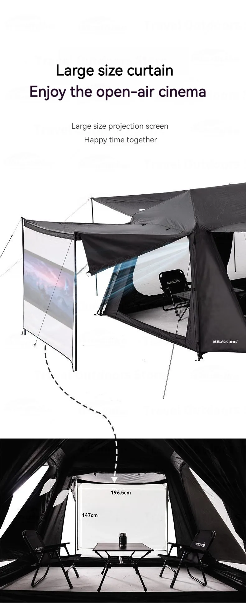 Packing List: 4 poles, storage bag, inner tent, outer tent, 21 nails, 9 ropes, ground cloth, projection screen