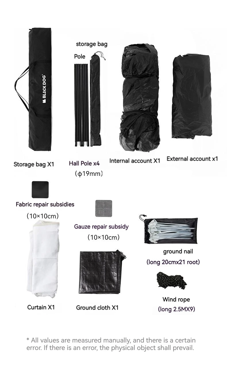 Packing List: pole,bag,inner & outer tent,nail,rope,ground mat,projection screen