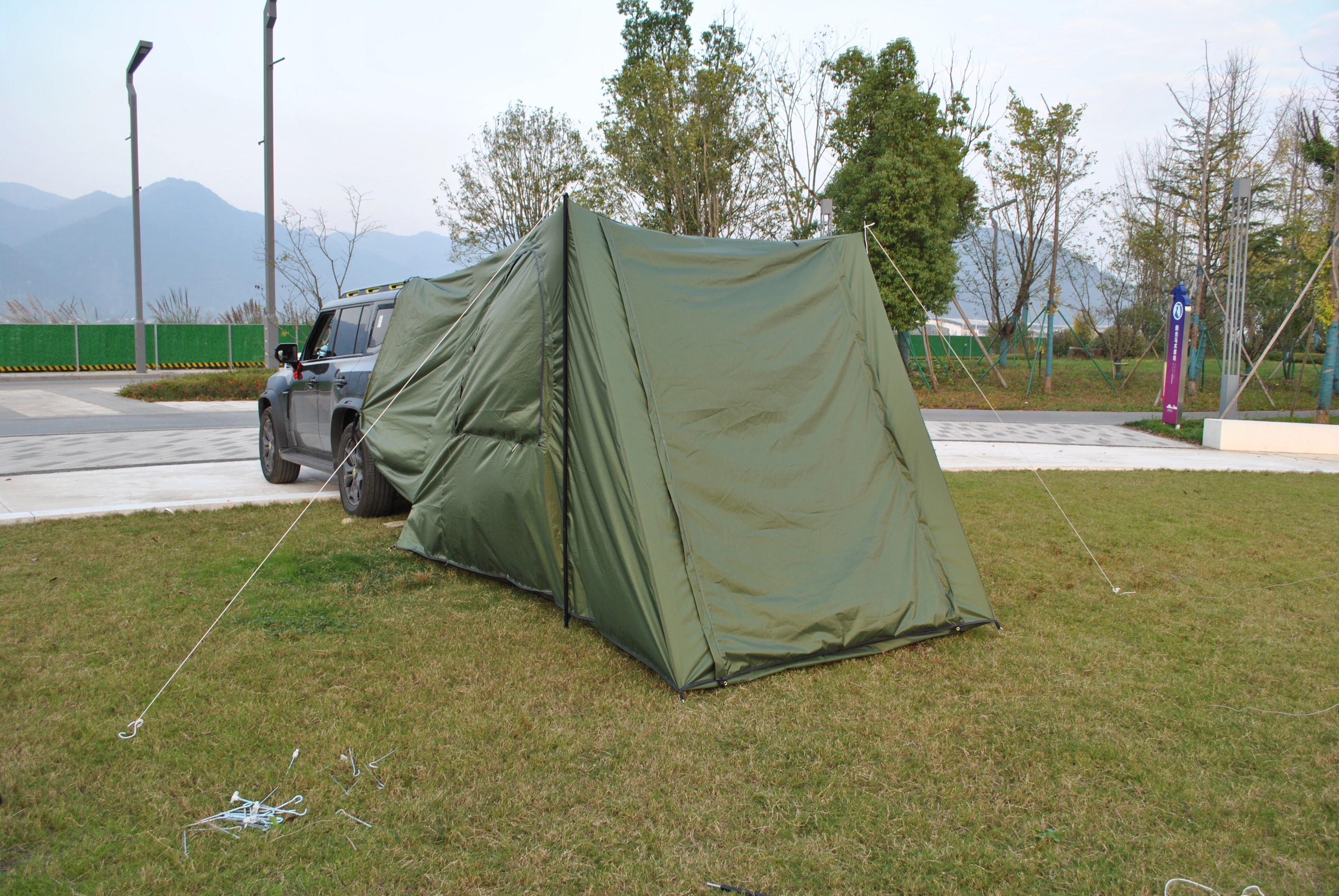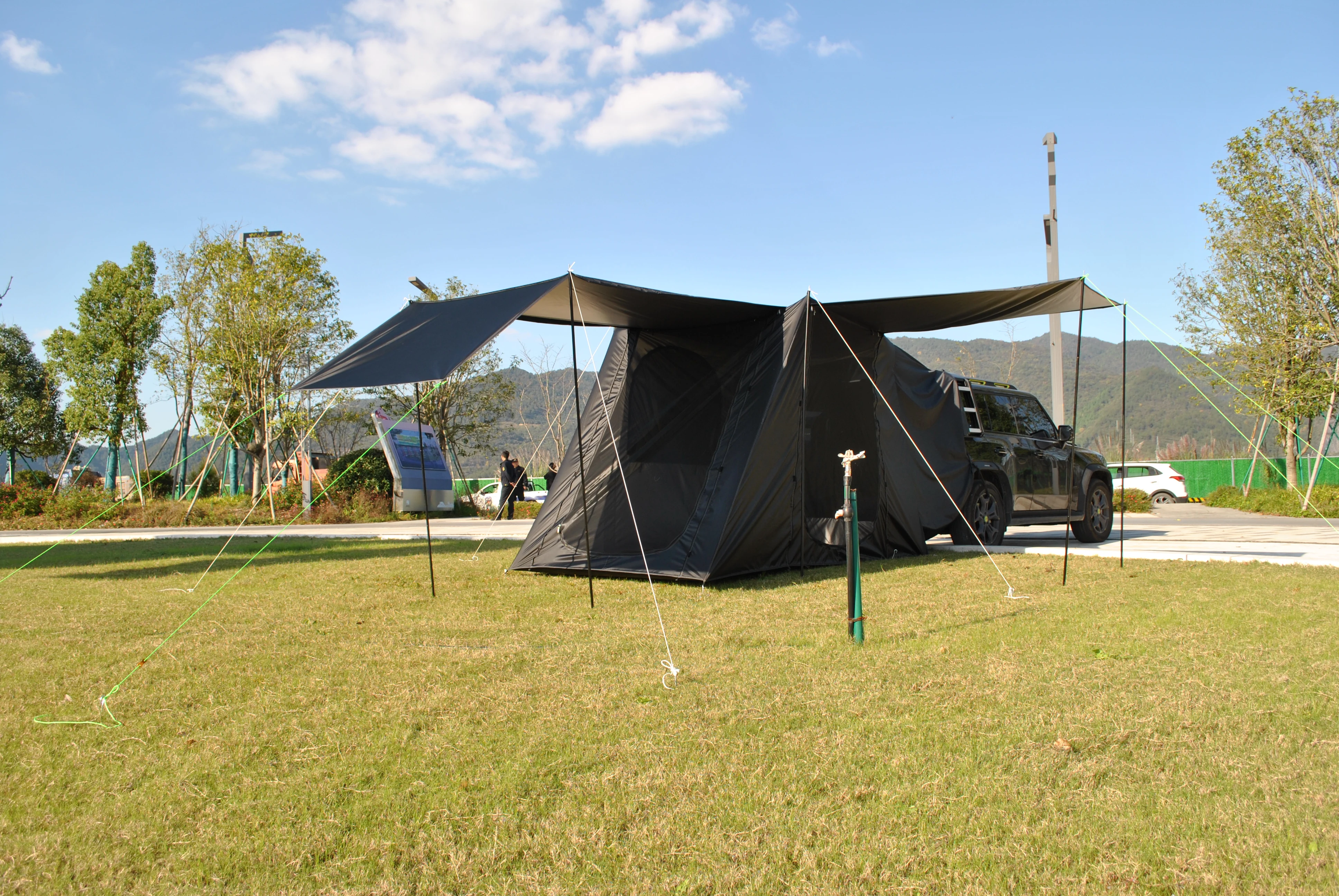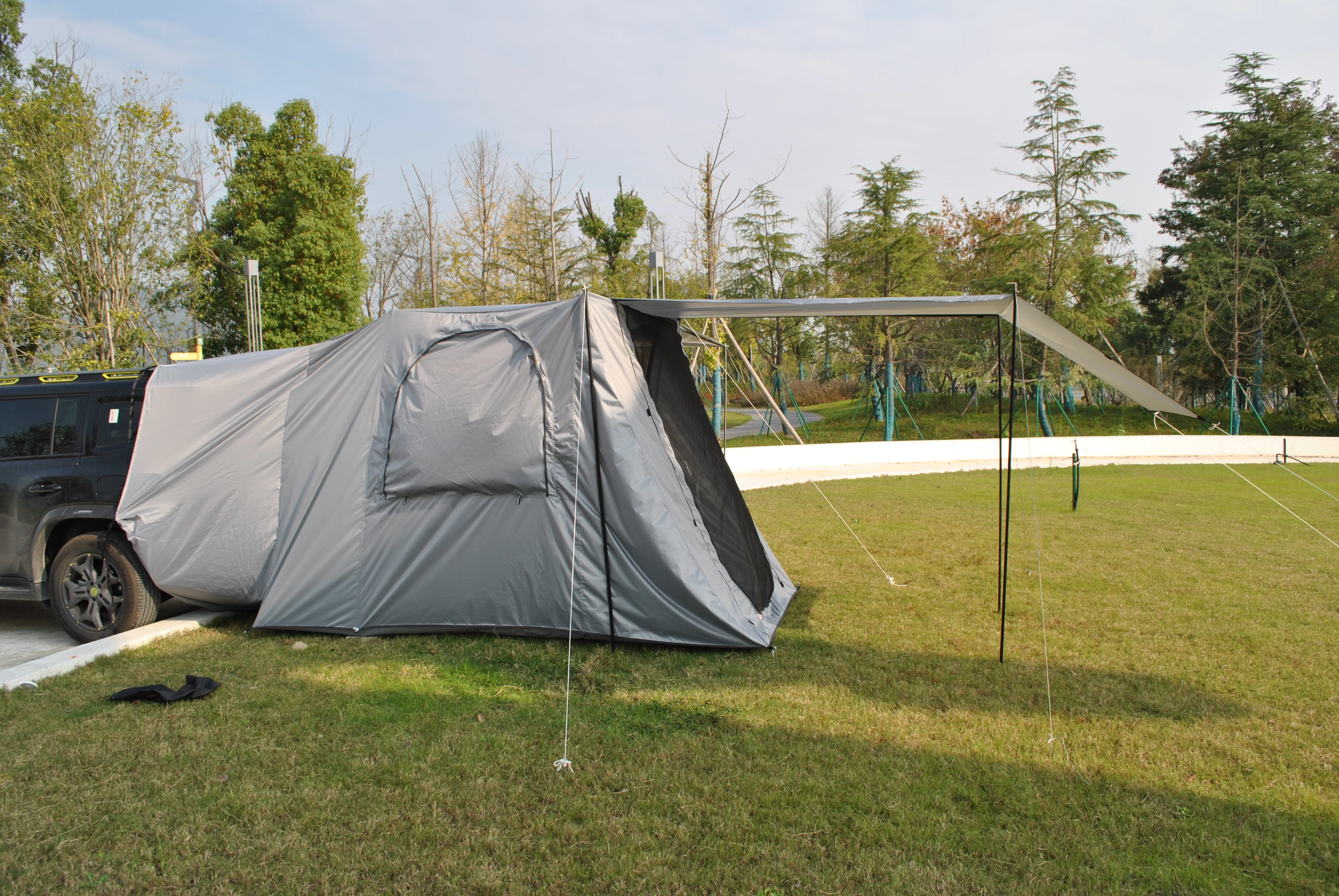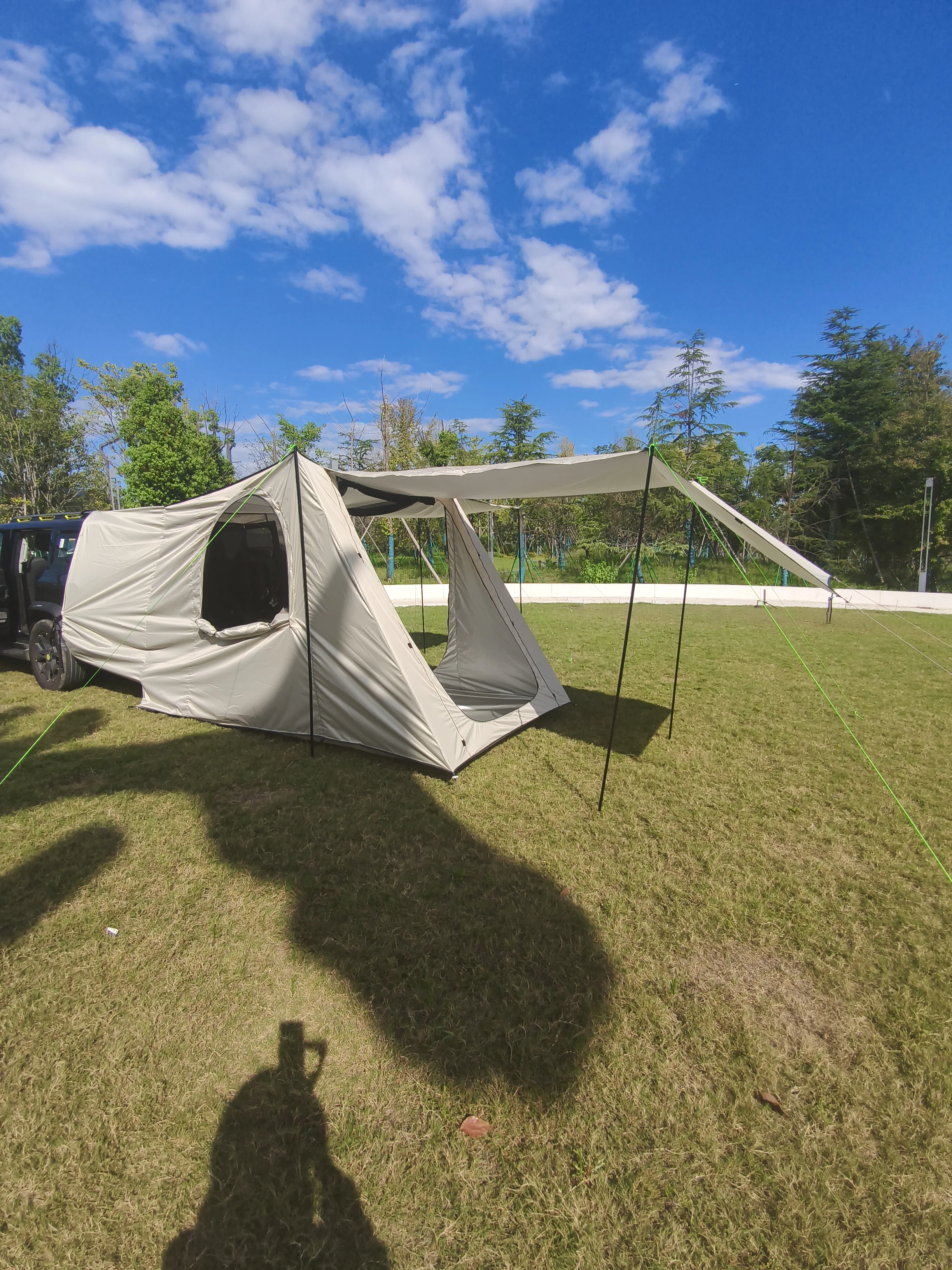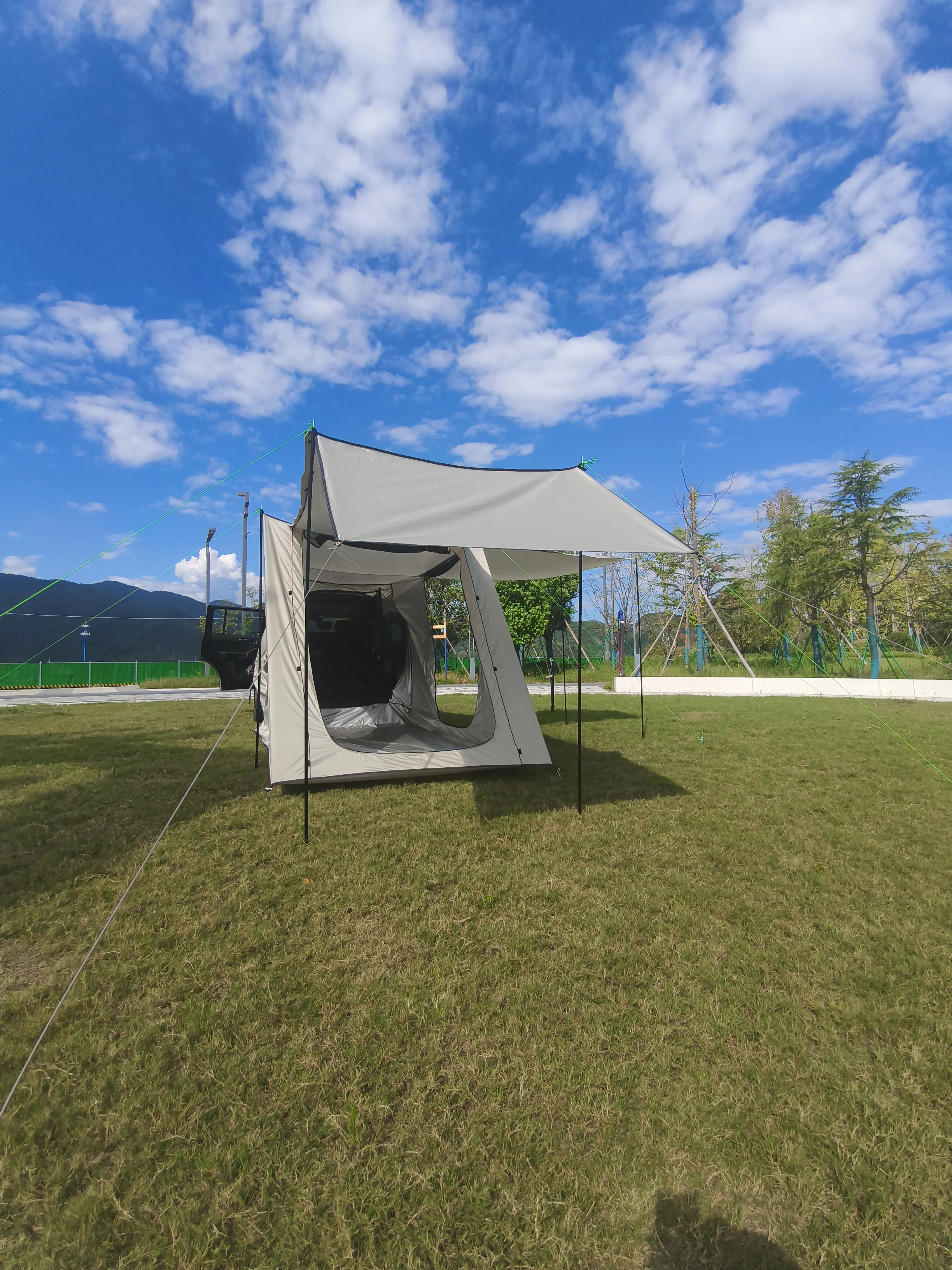 Functional features: This tent is an enlarged version of the rear compartment tent with dimensions of 300cm * 200cm * 210cm when used alone. Suitable size factory 3 meters, model 2 meters, height 2 meters, can accommodate 6 adults, and can also open the front and side doors, a total of 2 doors. At the same time, if it can be directly connected to SUVs and most cars, it can be detached from the rear of the car as a separate family camping tent or as a rear tent. The fabric is coated with silver for sun protection, with a waterproof index of up to PU4000, making it the preferred choice for rain and sun protection self driving tour car rear tents.