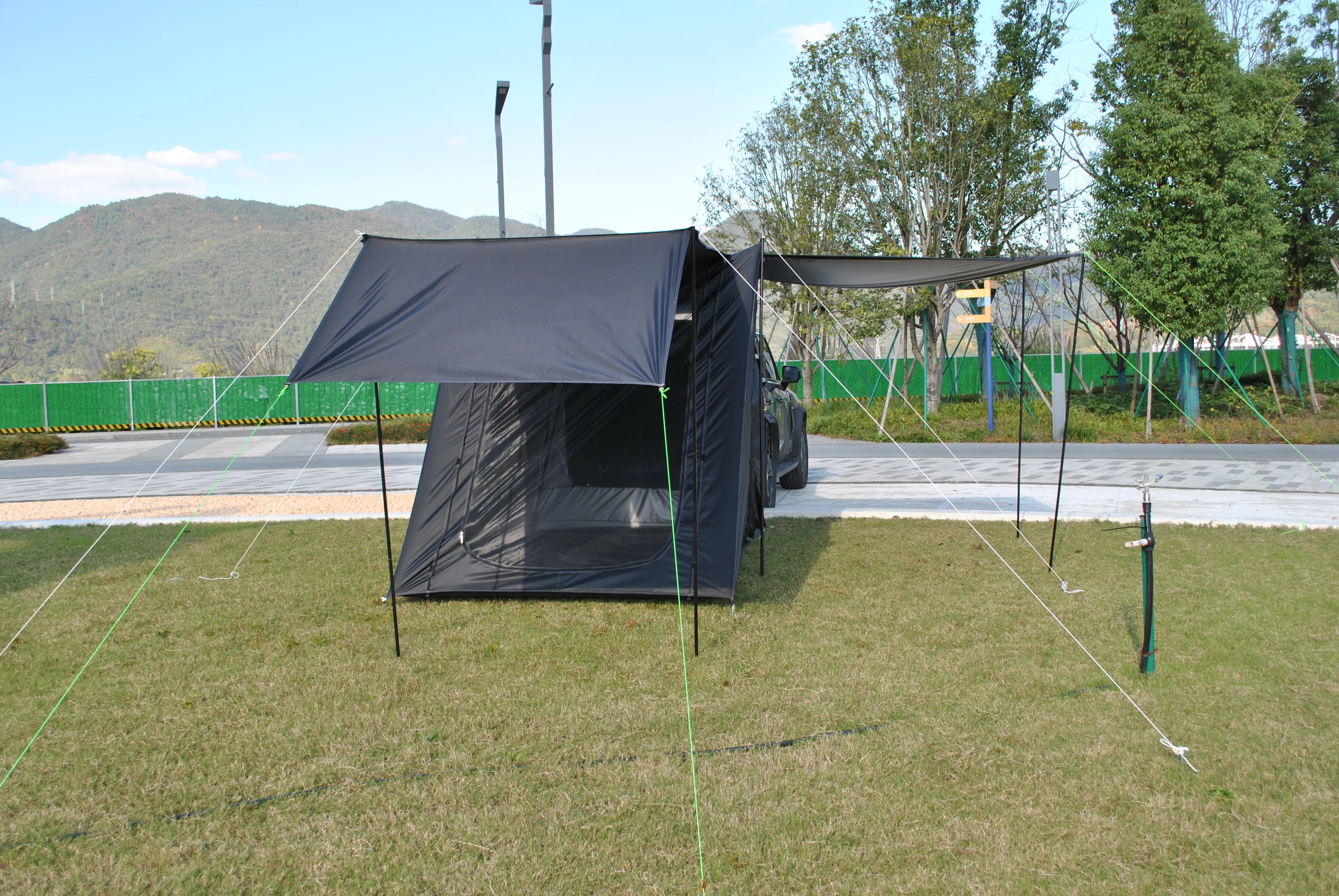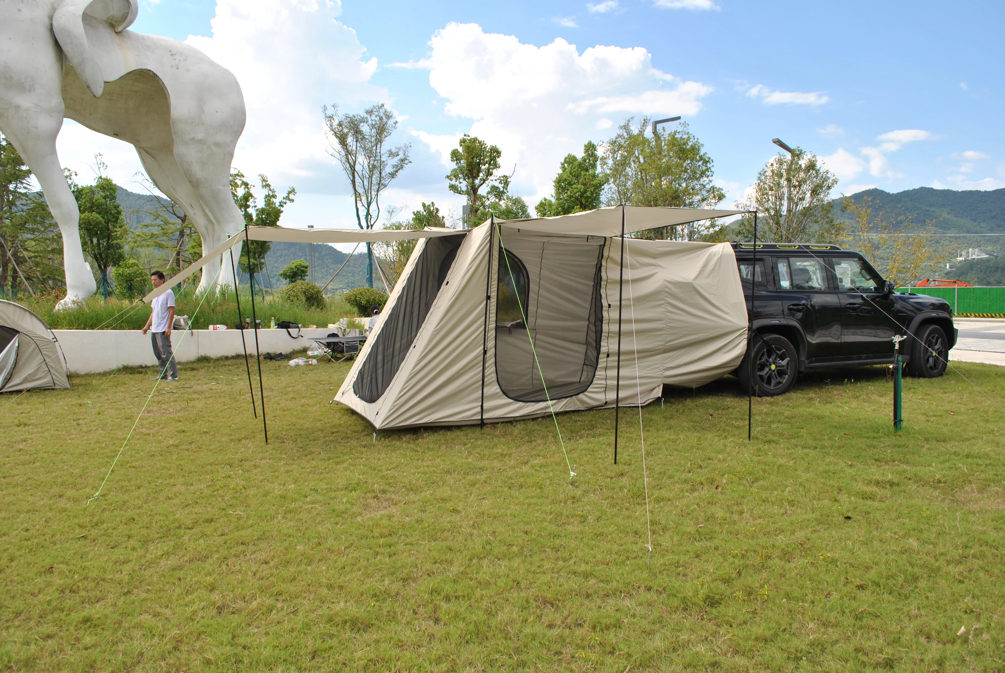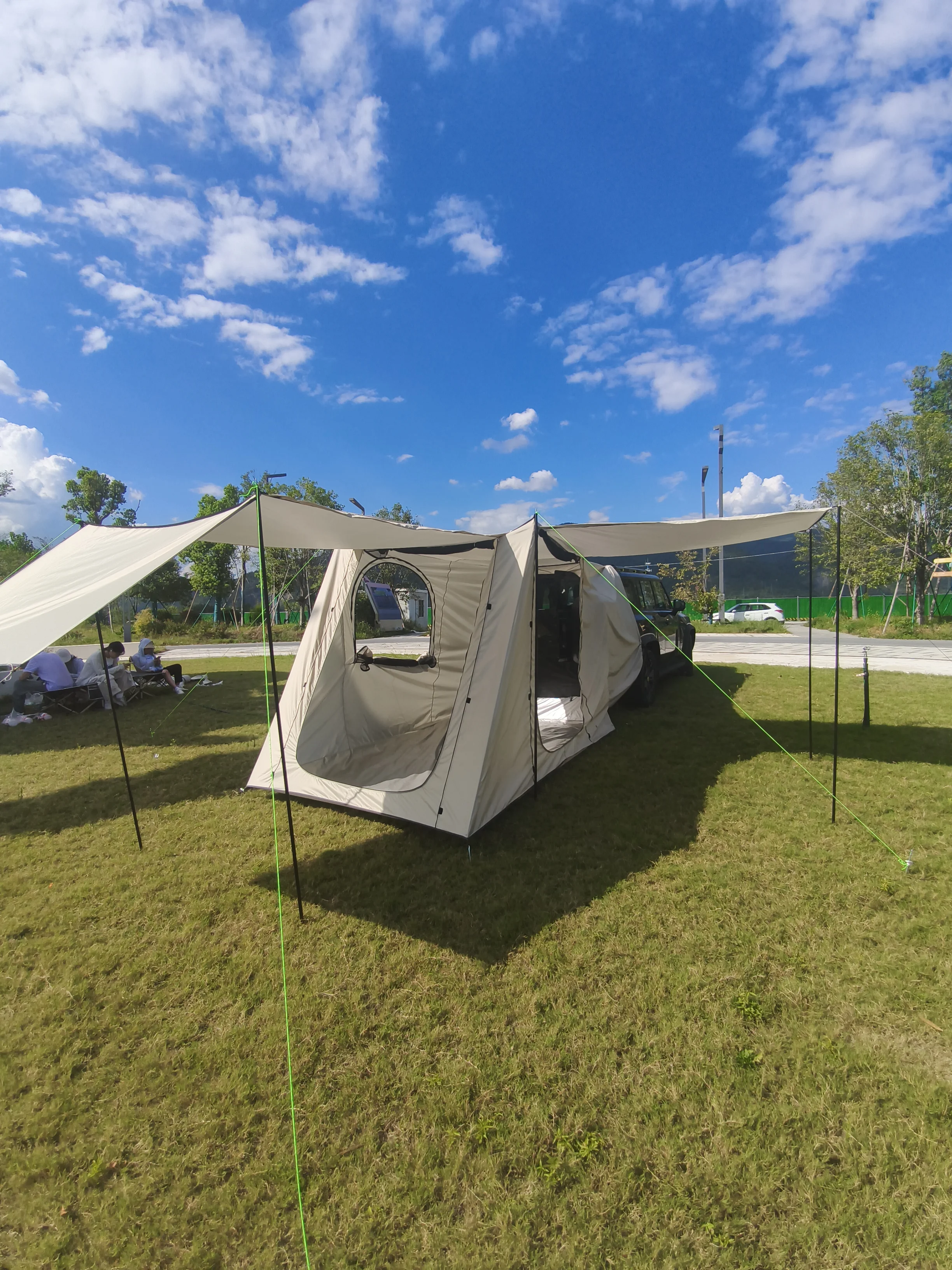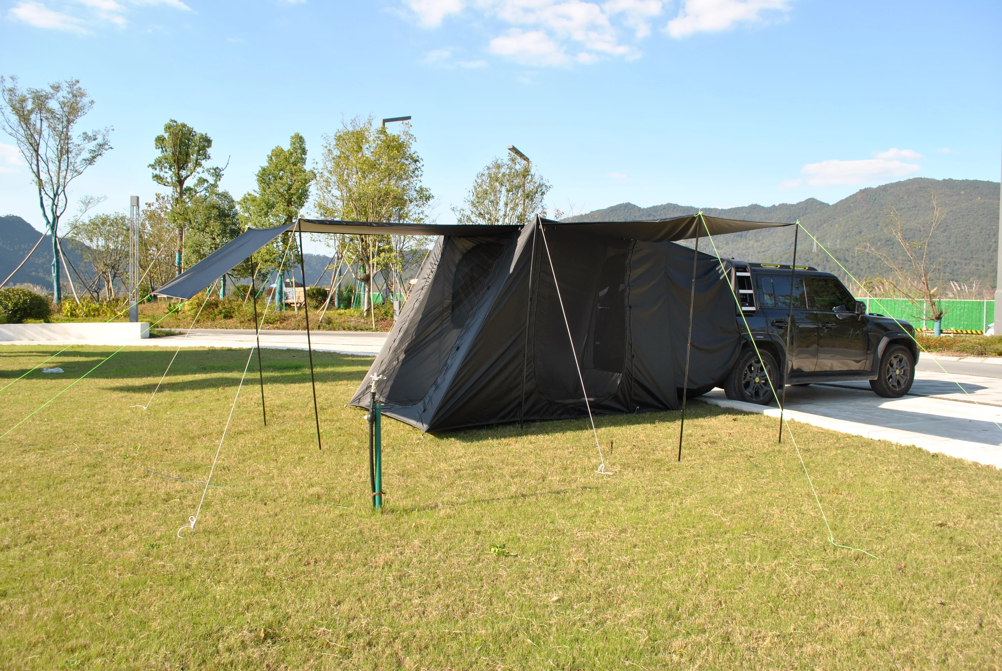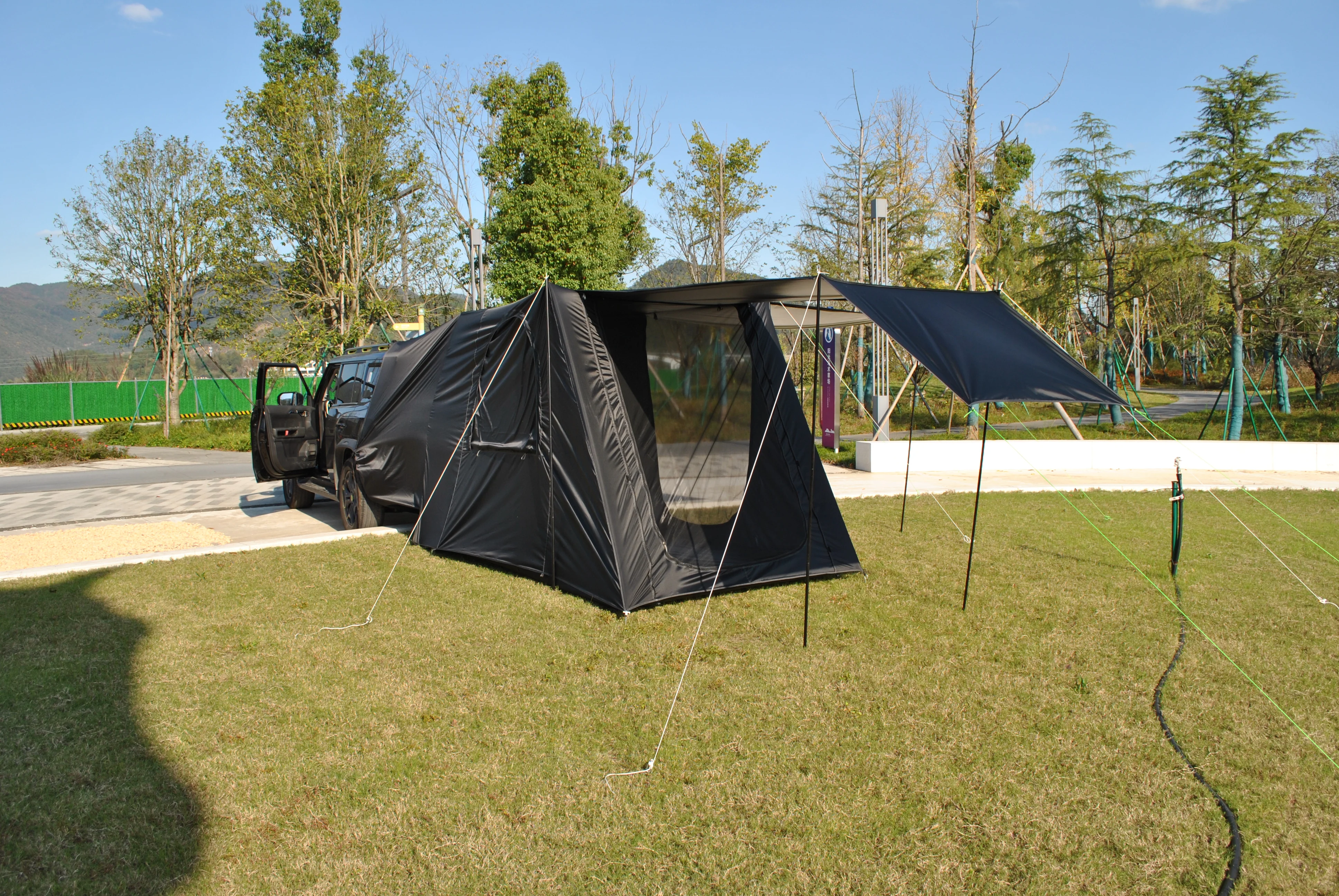 Functional features: This tent is an enlarged version of the rear compartment tent with dimensions of 300cm * 200cm * 210cm when used alone. Suitable size factory 3 meters, model 2 meters, height 2 meters, can accommodate 6 adults, and can also open the front and side doors, a total of 2 doors. At the same time, if it can be directly connected to SUVs and most cars, it can be detached from the rear of the car as a separate family camping tent or as a rear tent. The fabric is coated with silver for sun protection, with a waterproof index of up to PU4000, making it the preferred choice for rain and sun protection self driving tour car rear tents.