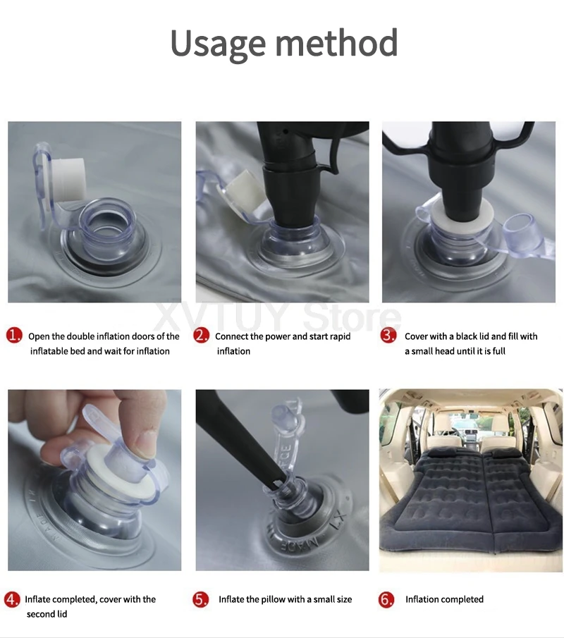 Unfold the cushion, turn on the air nozzle, it will automatically inflate, just manually inflate the pillow and wings. Every time you travel, the mat can provide you with high-quality sleep.